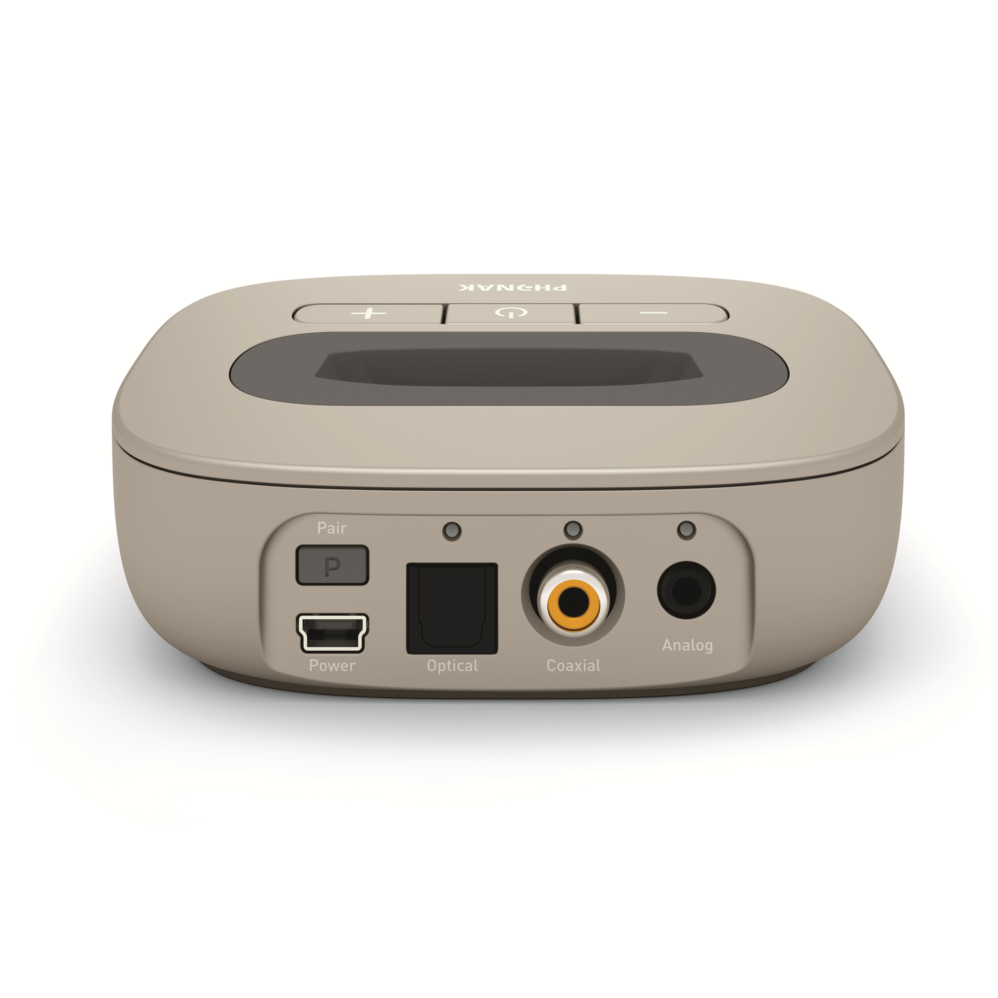 It will also serve as a charging cradle for your Phonak ComPilot/ComPilot II/ComPilot Air streaming device. The TV Link II comes with two different shaped inserts; one for the ComPilot/ComPilotII and one for the smaller ComPilot Air.